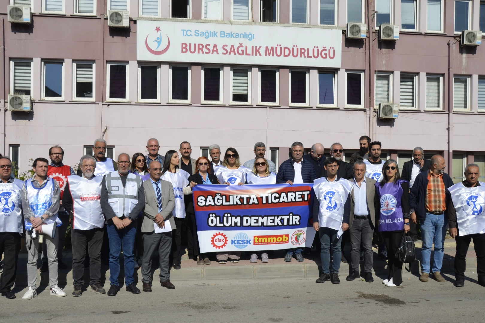 DİSK, KESK, TMMOB ve TTB Bursa Bileşenleri Bursa İl Sağlık Müdürlüğü önünde ‘Sağlıkta Ticaret Ölüm Demektir’ başlıklı basın açıklaması gerçekleştirdi.