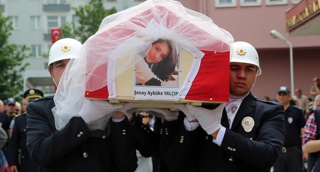 Batman'ın Kozluk ilçesinde Belediye Başkanı Veysi Işık'ın aracına yönelik terör saldırısında hayatını kaybeden 23 yaşındaki müzik öğretmeni Şenay Aybüke Yalçın için memleketi Çorum'un Osmancık ilçesinde tören düzenlendi.