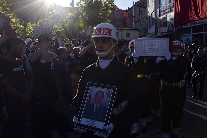 Şehidin 1 yıl önce evlendiği ve 4 aylık hamile olduğu öğrenilen eşi Elif Keskin, cenazeye eşinin askeri üniformasını giyerek katıldı.