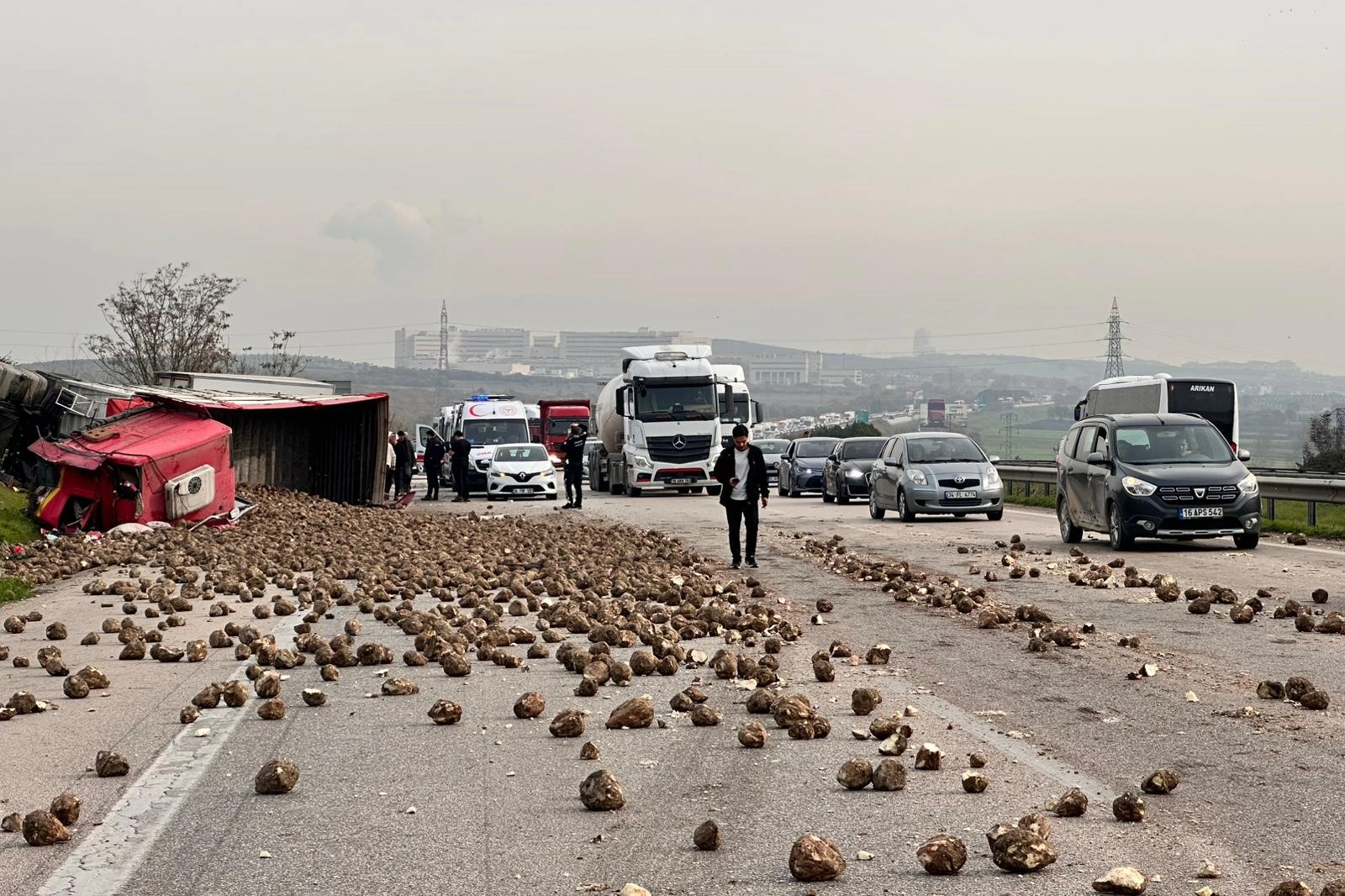 Bursa'da şeker pancarı yüklü tır kontrolden çıkıp, önce hafif ticari araca ardından kamyonete çarptı. Savrulan araçlar refüje girerken, tır devrildi. 1'i ağır 5 kişinin yaralandığı olay yerine çok sayıda sağlık ve polis ekibi sevk edildi.