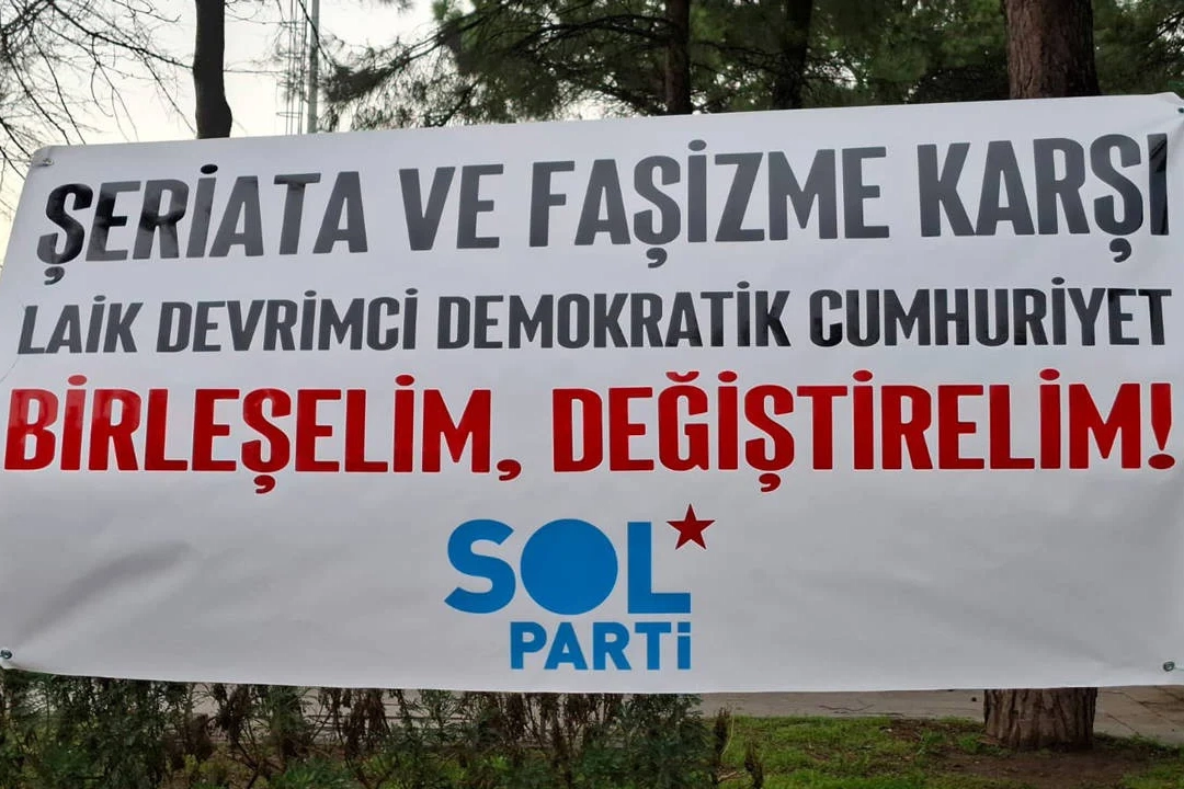 "Halkı kin ve düşmanlığa tahrik" suçlamasıyla mahkemeye sevk edilen SOL Partililere ev hapsi verilmesi üzerine, SOL Parti iktidarın ve gericilerin hedef tahtasına oturttuğu laiklik pankartını ülkenin dört bir yanına asmaya başlamıştı. (Kaynak: Birgün)