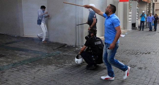 BEN SİZDENİM!Daha sonra elinde sopayla gösterici avındaki bu kişi bir arkadaşını arayarak yanına gelmesini istedi. Gelmediği için de arkadaşına küfürler savurdu. Sonra polislerin ikazıyla olayları uzaktan da olsa takip etmeyi sürdürdüm. Uzun süre bu mavi gömlekli kişinin peşinden gittim. İstiklal Caddesi'nde koşan başka bir çevik kuvvet polisinin peşinden o da koştu. Bir dükkana sığınan göstericilere hücum etti. Ancak esnaf kepenkleri kapatmıştı. Mavi gömlekli kişi de kepenklere onlarca kez sopayla vurdu. Eli sopalı adam daha sonra yine başka bir polis grubunun peşinden atağa kalktı. Ancak bu kez bir polis amiri bu kişinin elindeki sopayı almaya çalıştı. Önce sopayı vermek istemedi ve polise kendince haklı gerekçesini açıkladı: "Ben sizdenim..." Polis amiri bunun üzerine "Sizdeni bizdeni yok" diyerek sopayı zorla bu saldırganın elinden aldı.