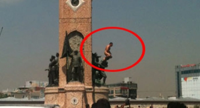 Saat 11.30 sularında meydanda bulunan heykelin üstüne çıkan çıplak bir adam Atatürk heykelinin üzerine oturdu ve çevreden geçenlere küfürler savurdu.