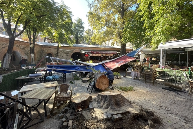 Tarihi Çarşı ve Hanlar Bölgesi'nde yer alan İç Koza Han'daki at kestanesi ağacı, sabah saatlerinde devrildi.