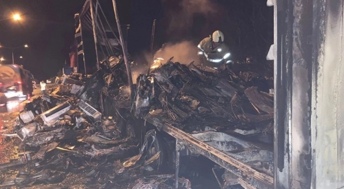 İtfaiye ekiplerinin müdahalesiyle söndürülen yangında tırda bulunan klimalar kullanılamaz hale geldi.