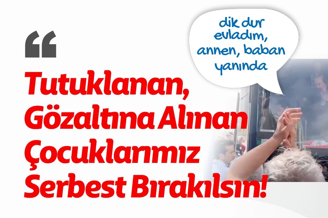 Biz tutuklanan, gözaltına alınan çocuklarımızın anne babaları olarak çocuklarımızın yanındayız. Tüm çocuklarımız özgür kalıncaya kadar dayanışma içerisinde olacağız. Onlar bizim geleceğimiz. #ÇocuklarımızaDokunmayın #ÇocuklarımızınYanındayız"