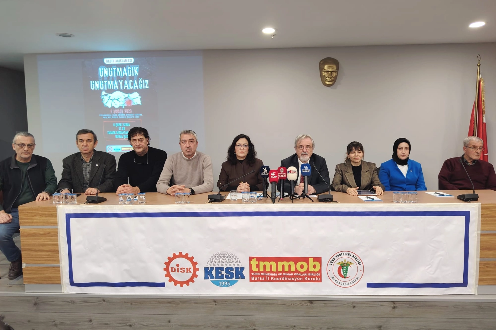 6 Şubat 2023’te Kahramanmaraş merkezli yaşadığımız depremlerin 3. yılında DİSK, KESK, TMMOB ve TTB ortak basın açıklaması düzenledi. Açıklamayı TMMOB Bursa İl Koordinasyon Kurulu Sekreteri Murat Korkut okudu.