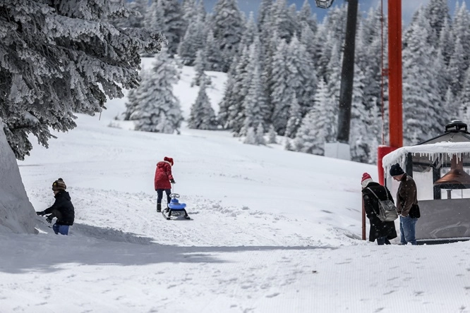 Bunu fırsat bilen tatilciler, çam ağaçlarıyla kaplı ormanlık alanda kayak yaptı, kızakla kaydı.