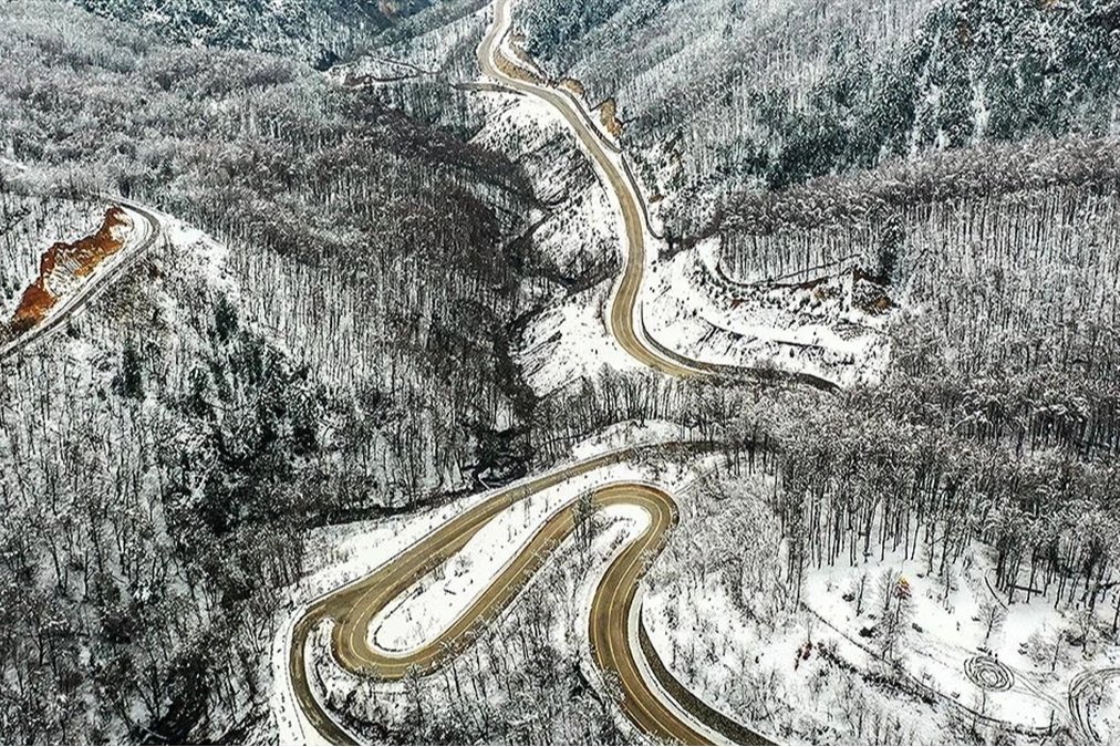 Ormanlık alanların içinden geçen Oylat Mağarası ve Oylat Kaplıcası'na giden ve karla bütünleşen kıvrımlı "S yolu" dronla görüntülendi.