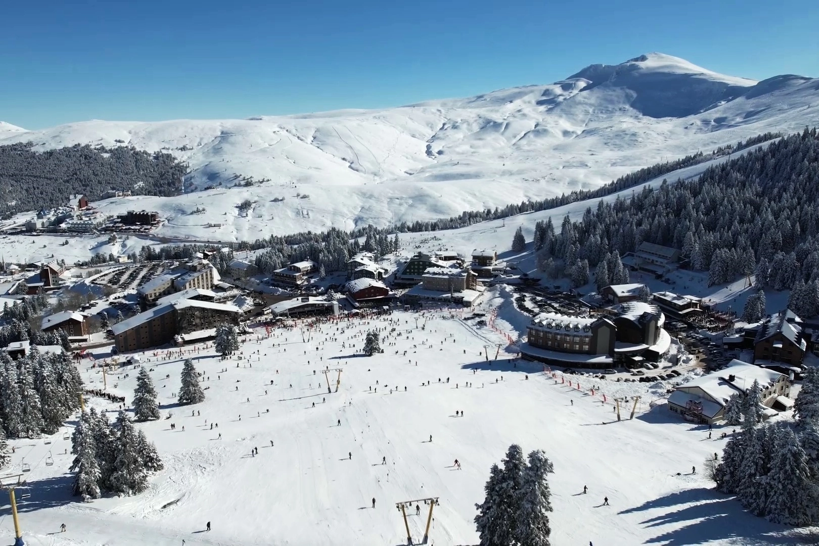 Drone görüntülerinde, Uludağ'daki yoğunluk net bir şekilde gözler önüne serilirken, kar manzarası ve pistlerdeki hareketlilik kış turizminin canlılığını bir kez daha ortaya koydu. Kar kalınlığının artmasıyla birlikte kayak sezonunun en yoğun günlerinden birini yaşayan Uludağ, beyaz örtüsüyle adeta görsel bir şölen sundu.