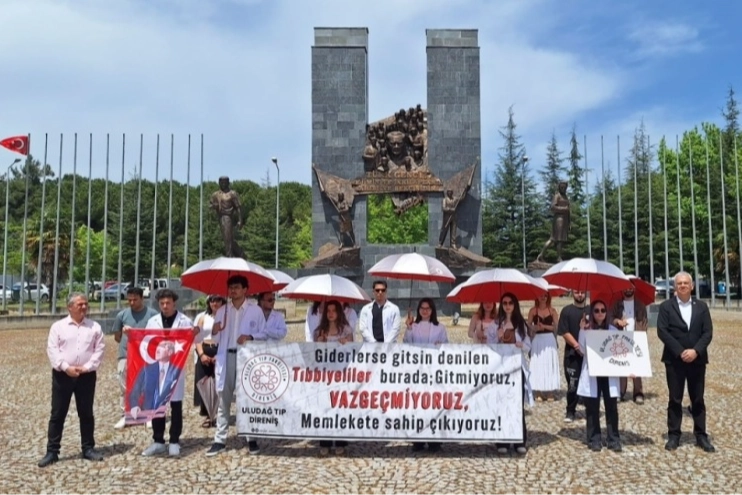 Protestolarına devam eden Tıbbiyeliler bugün de Şehit Ömer Halisdemir Tören Alanı'nda, "Gitmiyoruz, vazgeçmiyoruz, memlekete sahip çıkıyoruz" yazılı pankartla durma eylemi gerçekleştirdi.