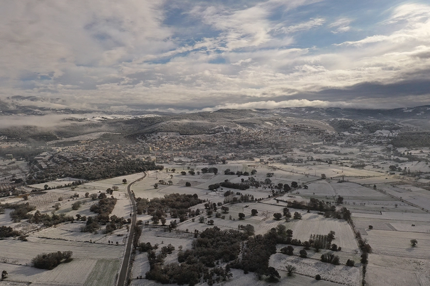 Kar beyazı ve sisle bütünleşen ilçe merkezi ile çevresindeki tarım arazileri dronla görüntülendi.