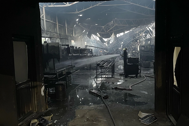 Çatısı ve içi kısmen yanan fabrikada itfaiyenin soğutma çalışmaları sürüyor.