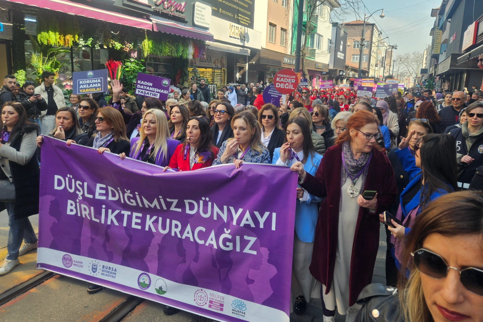 Bursa Büyükşehir Belediyesi, Nilüfer Belediyesi, Osmangazi Belesiyesi ve kent konseylerinin kadın meclisleri tarafından Barış Kadın Bandosu eşliğinde saat 14.00'da Cumhuriyet Caddesi'nde yürüyüş düzenlendi. 'Düşlediğimiz dünyayı birlikte kuracağız' mottosuyla düzenlenen yürüyüşte kadınlar, alkış ve ıslıklarla "Dünya yerinden oynar, kadınlar özgür olsa", "Susmuyoruz, korkmuyoruz, itaat etmiyoruz", "Kadın cinayetleri politiktir" sloganları attı.