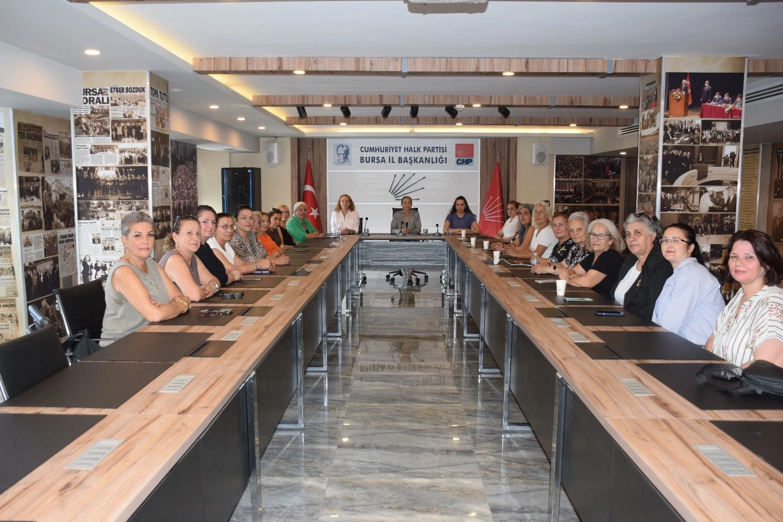 CHP Bursa İl Başkanlığı'nda kadın cinayetlerine dikkat çekmek amacıyla gerçekleştirilen basın açıklamasına Bursa İl Kadın Kolları Başkanı Nigar Bölüker, Kadın Kolları MYK Üyesi Fatma Özgür, İlçe Kadın Kolları Başkanları ve yöneticiler katıldı.