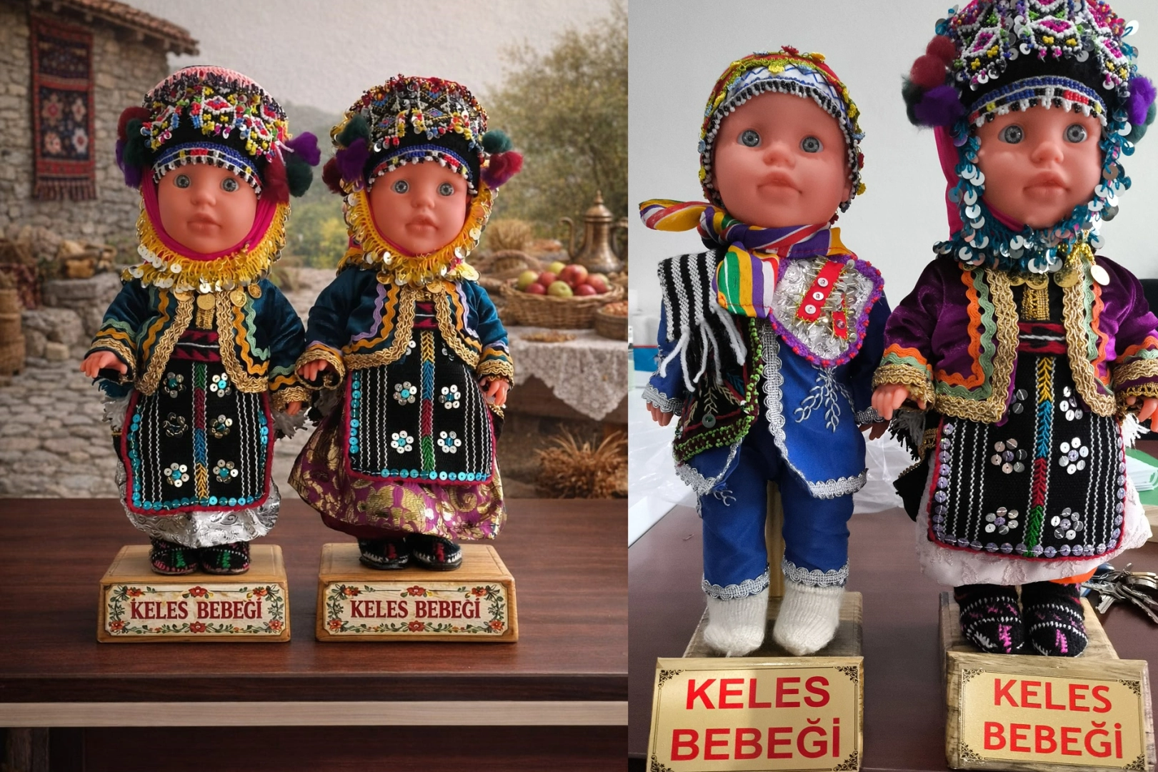 Erkek ve kadın figürleri bulunan bebekler, üç farklı boyutta hazırlanırken, yöreye özgü kıyafetlerin minyatür birebir örnekleriyle dikkat çekiyor.