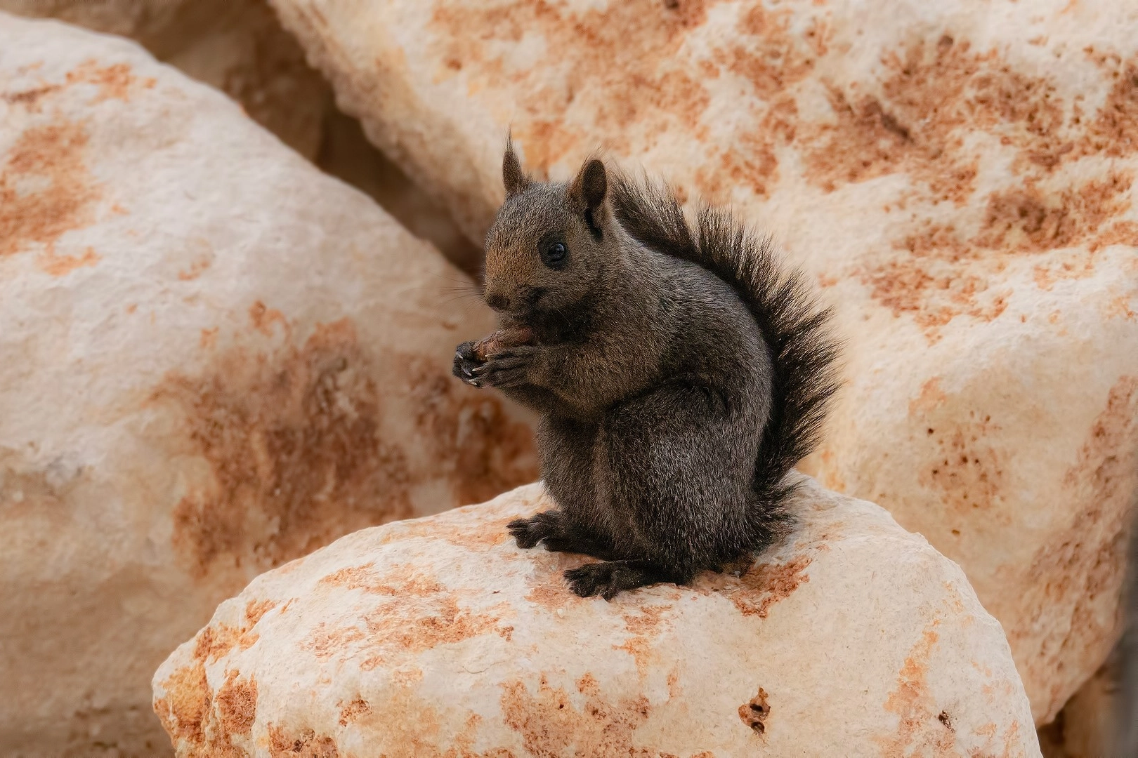 Bursalı doğa fotoğrafçısı Ömer Ahu tarafından Tunceli'nin Pülümür ilçesinde görüntülenen melanistik sincap, diğer sincaplarla kıyaslandığında koyu ve siyah kürküyle göze çarptı.