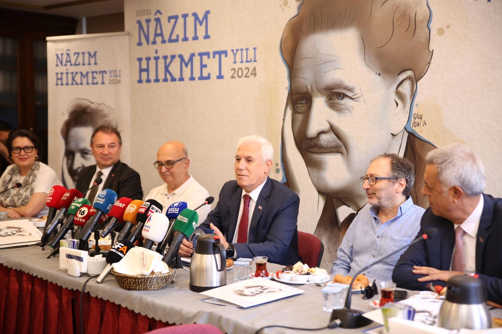 Şiirleri 50’den fazla dile çevrilen, edebiyatımızın onur abidesi, büyük usta Nâzım Hikmet’in 61 yıl önce bedenen aramızdan ayrıldığını dile getiren Başkan Bozbey, yaşama ve memlekete dair derdi olan isimlerin belleklerimizde daima yaşadığının da altını çizdi. Nâzım’ın şiirlerinin ve düşüncelerinin günümüzde hala inadına yaşadığını, mücadelesinin ve umudunun ilham vermeye devam ettiğini söyleyen Başkan Bozbey, “Evrensel sesi, emeği, adaleti ve barışı her şeyin üstünde tutan dünya görüşü, kentimizin kültürel rotasına ışık tutacağına inanıyoruz. Bu nedenle Bursa Büyükşehir Belediyesi olarak 2024 yılını ‘Nâzım Hikmet’e adıyoruz. Yıl boyunca gerçekleştireceğimiz etkinlikler aracılığıyla Nâzım Hikmet’i anacak, onun Türk şiirinde çığır açan şiirlerinin rehberliğinde, söyleşiler ve atölyeler gerçekleştireceğiz. Bursa’mızın Nâzım Hikmet’in kişisel yaşamında çok önemli bir yeri var. ‘Bursa’da özgür bir gün’ sergisi ve ‘Çok şükür yaşıyoruz-şarkılarla, şiirlerle Nâzım Hikmet’ dinletisiyle ‘Nâzım Hikmet Yılı’nı kentimizle buluşturmaktan mutluluk duyuyorum. Yazar ama aynı zamanda Basın, Yayın ve Halkla İlişkiler Daire Başkanımız olan Güney Özkılınç’ın ‘Nâzım’ın Bursa Yılları’ adlı eserinden Nâzım Hikmet’in Tayyare Kültür Merkezi’ne, arkadaşı Bursalı karikatürist Cemal Nadir’in açtığı sergiyi haber yapmak için 24 Mayıs 1936 tarihinde ilk kez kelepçesi olmadan, muhabir olarak geldiğini öğreniyoruz. İzlenime açacağımız sergiyi de o günün anısına Bursalılarla buluşturuyoruz. Ülkemizin bu değerli isimleri, olması gerektiği gibi Bursa’mızın caddelerinde, salonlarında, eserlerinde daima yaşamaya devam edecek. Tüm halkımızı, etkinliklerimize katılmaya ve Nâzım Hikmet’in barış, adalet ve özgürlük arzusuyla çınlayan sesine kulak vermeye davet ediyoruz” diye konuştu. Nâzım Hikmet Kültür Vakfı Genel Sekreteri Turgay Fişekçi, Nâzım Hikmet’in hayatının önemli bir bölümünü cezaevinde ve cezaevi yıllarının büyük bölümünü de Bursa’da geçirdiğini hatırlattı. Bursa ile Nâzım Hikmet isimleri arasında çok sıkı yakınlık bulunduğunu anlatan Fişekçi, usta şairin hayatından kesitler paylaştı. ‘Memleketimden İnsan Manzaraları’ eserini, ‘Ferhat ile Şirin’ oyununu Bursa cezaevindeyken yazdığını hatırlatan Fişekçi, Nâzım ile Bursa buluşmalarının artarak devam etmesini temenni etti.