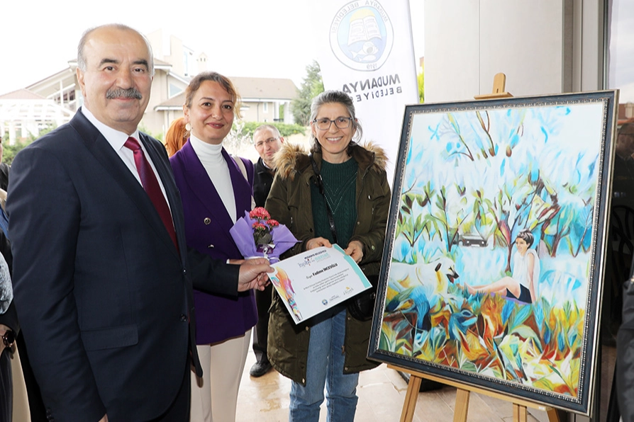 Mudanya Belediye Başkanı Hayri Türkyılmaz, eşi Gülbahar Türkyılmaz ile Hanımeli İmece Evi'nde "Dünya Kadınlar Günü" nedeniyle açılan ve geliri depremzedelere bağışlanacak olan resim sergisini gezdi.