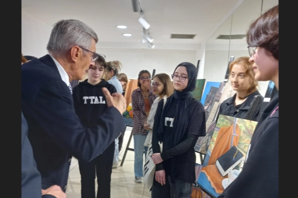 Görsel Sanatlar öğretmenleri Gülçin Övet ile Neşe Aydın'ın rehberliğindeki öğrencilerin 40 parçadan oluşan yağlı boya resim sergisini gezen Turhan Tayan, öğrenci ve öğretmenleri ortaya koydukları çalışmadan dolayı kutladı.