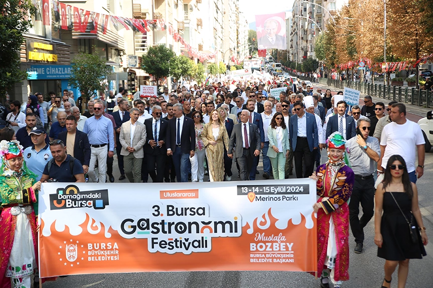Bursa’nın tescilli lezzetlerini dünyaya duyurmak amacıyla ‘Damağımdaki Bursa’ temasıyla üçüncü kez düzenlenen ve bu yıl uluslararası katılımla gerçekleştirilen ‘Gastronomi Festivali’, kortej yürüyüşüyle başladı. Bu yıl öncekilerden farklı düzenlenen festival, konserlerden yarışmalara, rekor denemelerinden usta şeflerin katılacağı söyleşilere kadar 3 gün boyunca dolu dolu programlarla gerçekleştirilecek.