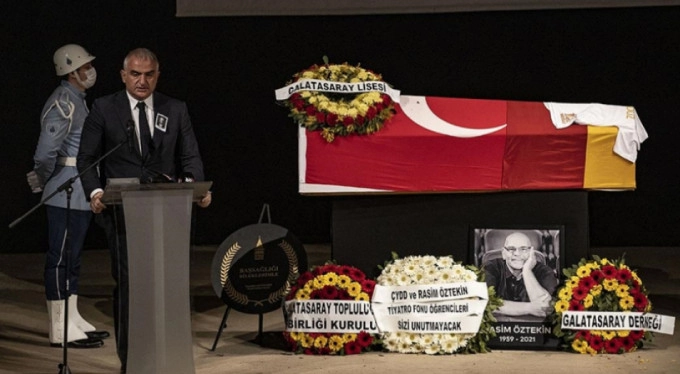 Kaldırıldığı hastanede 62 yaşında hayatını kaybeden usta oyuncusu Rasim Öztekin'in Türk bayrağına sarılı tabutu, Galatasaray Lisesi'nin ana kapısından çıkarak, anma töreni için Ses Tiyatrosu'na götürüldü.
