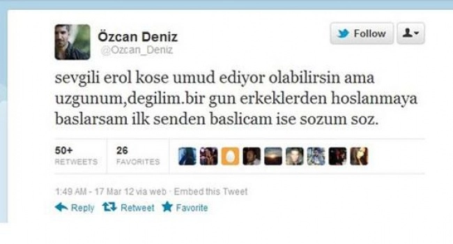 Sivri dilli yapımcı Köse'nin attığı tweet üzerine Özcan Deniz iddialara aynı şekilde Twitter'dan yanıt verdi. Özcan Deniz, Erol Köse'ye attığı tweet : "Sevgili Erol Köse umud ediyor olabilirsin ama üzgünüm,degilim. Bir gün erkeklerden hoslanmaya baslarsam ilk senden baslicam ise sözüm söz."