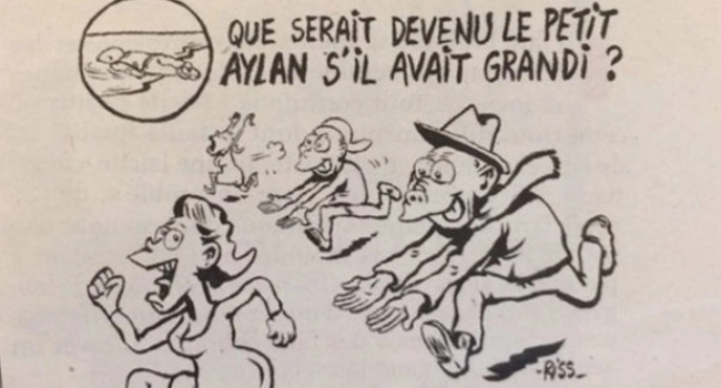 BBC Türkçe'de yer alan habere göre, Charlie Hebdo dergisinde yayımlanan "Göçmenler" başlıklı karikatürde Aylan Kurdi'nin kıyıya vuran cesedi bir balon içinde görünüyor ve yanında "Küçük Aylan büyüdüğünde ne olurdu?" diye soruluyor. Bu sorunun altında da koşarak kaçan bir kadını, elleri açık halde kovalayan iki erkek görülüyor. Karikatürün altında da Fransızca'da arkadan elle tacizde bulunanlar için kullanılan 'Tripoteur' kelimesi kullanılarak "Almanya'da tacizci" olabileceği ifade ediliyor.