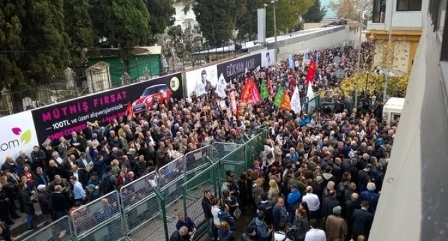 "Türkiye'nin iki saygın gazetecisi yaklaşık 12 saatlik tiyatronun ardından tutuklanmıştır. Ve ceza evine gönderildiler. Dün bütün gün boyunca onlarla birlikteydim. Orada nasıl bir tiyatronun 12 saat boyunca oynanıldığına hep birlikte şahit olduk.