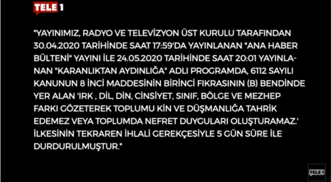 RTÜK üyesi İlhan Taşçı, açıklamasının devamında, "TELE 1 ve Halk TV'nin ekranı 5 gün boyunca tamamen karartılacak. Belgesel, müzik dahi yayınlanamayacak. İzleyiciler 5 gün boyunca yalnızca siyah ekran görecek. Demokrasinin olmazsa olmazı basın özgürlüğünün bel kemiği kırılmıştır" dedi.