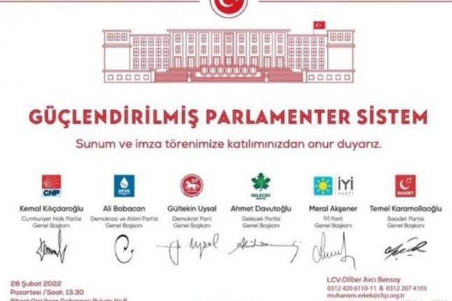 Başlığında, "Güçlendirilmiş Parlamenter Sistem" yazan davetiyede, 6 partinin logoları ve genel başkanlarının isimleriyle birlikte imzaları yer alıyor.