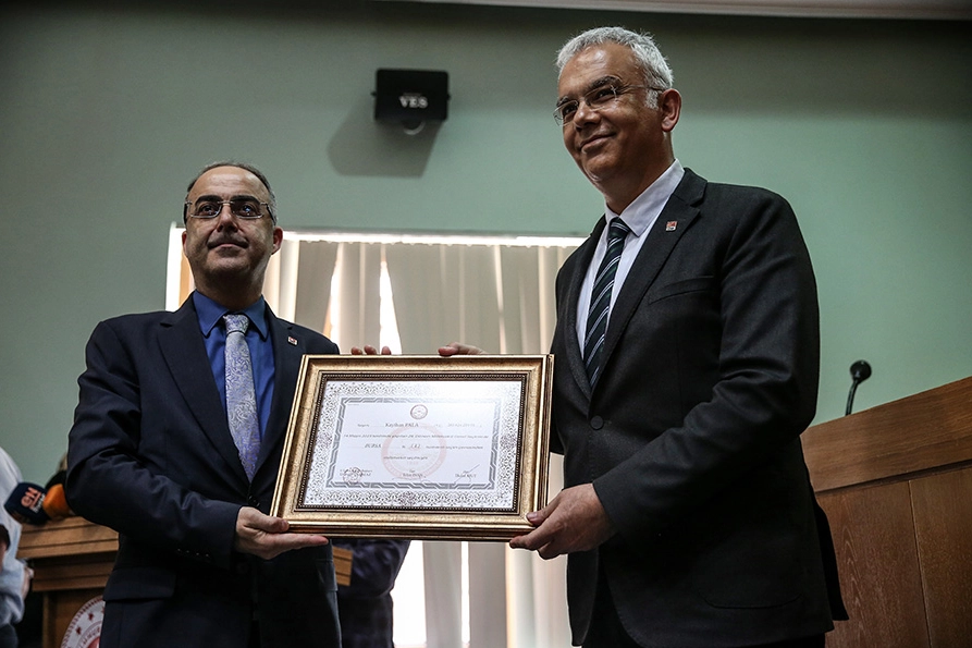 İstiklal Marşı'nın okunmasının ardından İl Seçim Kurulu Müdürü Mehmet Us, mazbatalarını alacak milletvekillerini tebrik ederek, hayırlı olması temennisinde bulundu.
