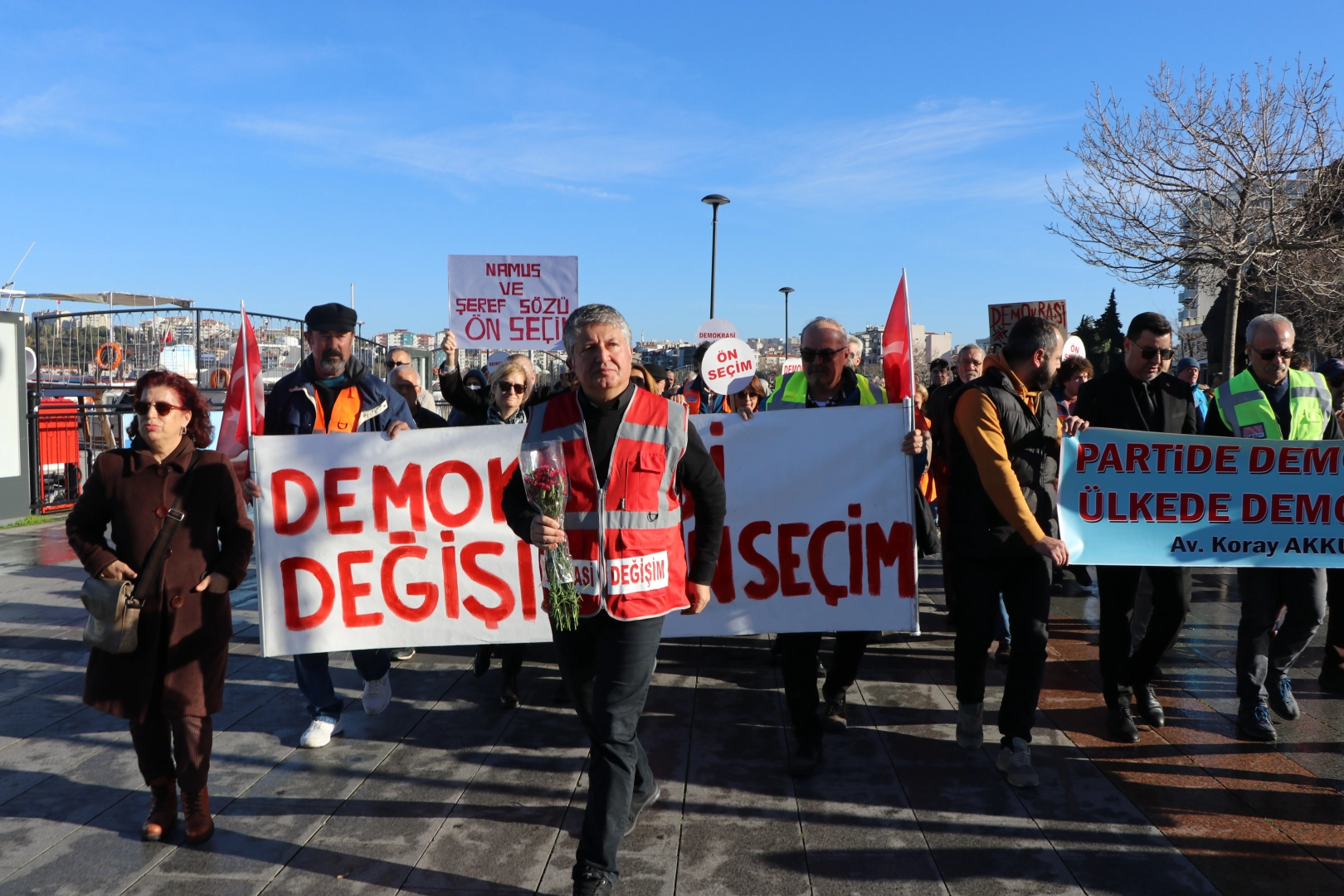 İrfan Mutluay ve kendisini destekleyen partililer, üzerinde "demokrasi-değişim-ön seçim" yazılı pankart ve dövizlerle Kordonboyu'ndaki Truva Atı önünde bir araya geldi.
