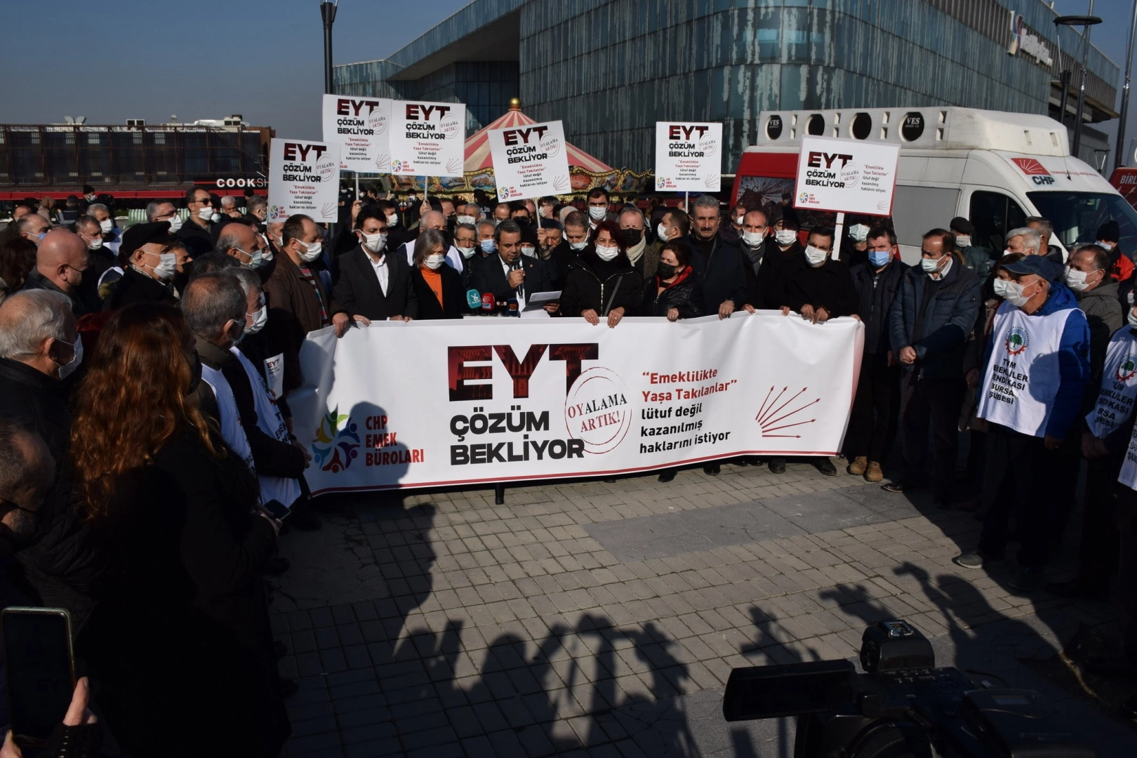 “Emeklilikte Yaşa Takılanlar, yaş engeliyle birlikte bir de AKP-MHP engeline takılıyorlar. Cumhuriyet Halk Partisi olarak bu mağduriyete son vermek için attığımız her adımda, karşımızda AKP-MHP ittifakını gördük. TBMM’de, Emeklilikte Yaşa Takılanların kazanılmış haklarına kavuşabilmeleri için verdiğimiz tüm kanun teklifleri AKP-MHP oylarıyla reddedildi. İktidar EYT mağdurlarına “Daha gençsin, emekli olamazsın” diyor. Öte yandan işverenler ise “Sen yaşlısın, sana iş veremem” diyor. İktidarın kurduğu düzen beş milyona yakın vatandaşımıza adeta “Sen yoksun” diyor. Öte yandan, emeklilik hakkı elinden alındığı için halen çalışmak zorunda olan vatandaşlarımız iş cinayetlerinde can vermeye devam ediyor. 2013 yılından bugüne emeklilik yaşı gelmiş olduğu halde emekli olamayıp çalışan 2 binden fazla işçi, iş cinayetlerinde yaşamını yitirdi. Bir başka deyişle EYT’liler sadece açlıkla değil; iş kazaları ve iş cinayetleri ile de sınanıyor.”