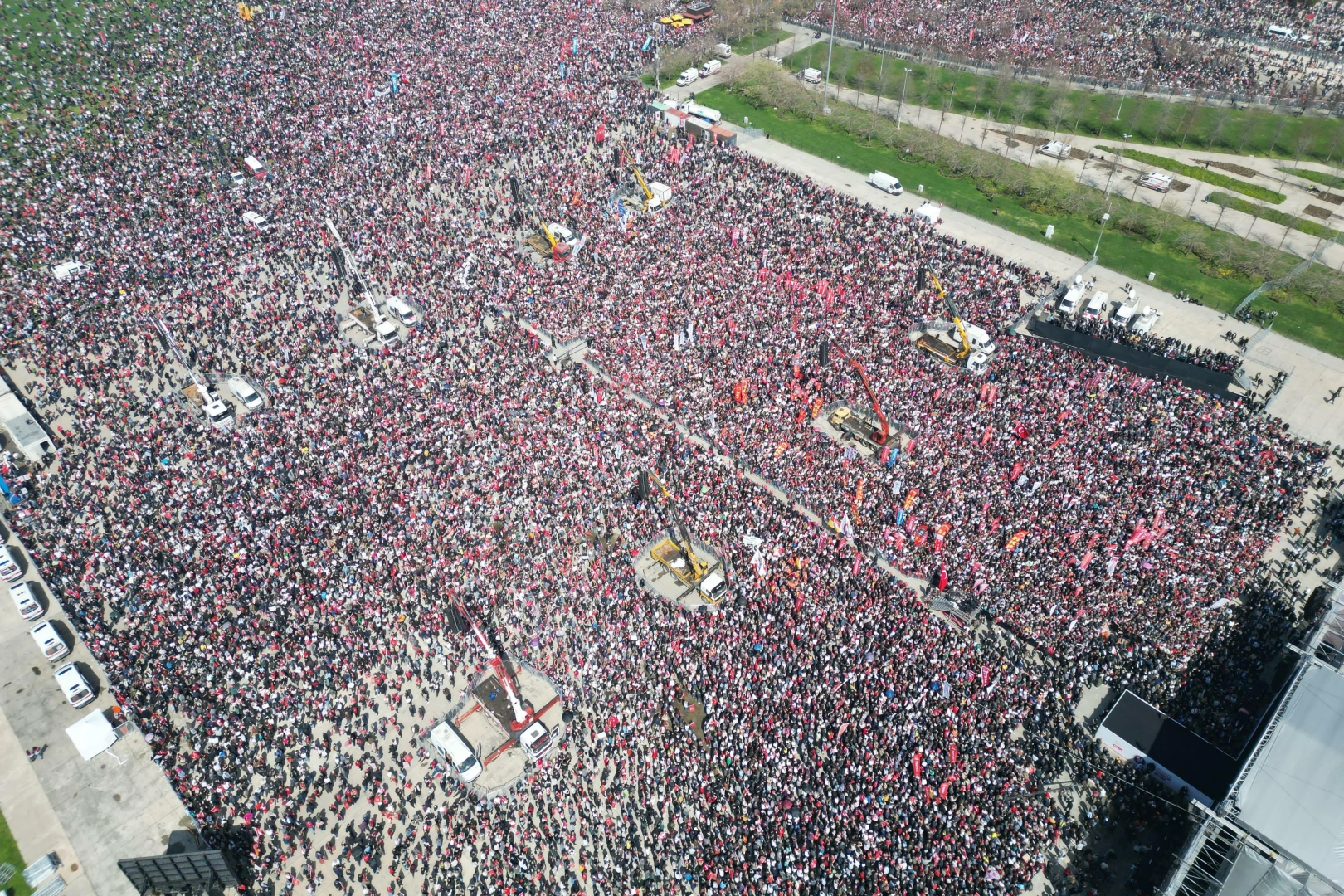 Ekrem Başkan Silivri'de dedi ki: "Koroyu dinledim, dünyanın en büyük korosuyla cezaevinde geçirdiğim ilk gece birlikte şarkı söyledim. Teşekkür ederim." O teşekkürü Saraçhane'ye iletirken ki buradan o gece dünyanın en büyük korosuyla Ekrem Başkan'a seslenen milyonlara şükranlarımızı sunuyoruz ama ben dedim ki bekle, daha büyüğünü getireceğim. Dünyanın en büyük korosu hazır mıyız? Hazır mıyız?