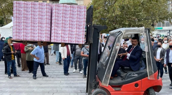 Halen yapılmakta olan bin 100 yataklı Ali Osman Sönmez Devlet Hastanesi'nin 900 Milyon TL'lik maliyetini örnek göstererek, bu hatta harcanacak para ile her biri aynı özelliklerde 2 büyük hastane yapılabileceğine vurgu yaptıklarına değinen Türkoğlu, "Bilin bakalım şimdi ne olacak? Bir aya kalmaz üçüncü bir ihale yapılır. Ne yapılır edilir yine aynı yandaş şirkete, hem de bu kez maliyetler çok arttı denilerek 2 Milyar TL'nin, yani eski parayla 2 Katrilyon TL'nin üzerinde bir rakama hediye edilir. Olan yine milletin yok canından ödeyeceği paralara olur." diye konuştu. Türkoğlu, "Buradaki soygunu anlatırken yaklaşık 13,5 ton ağırlığındaki 600 Milyon TL parayı bir forklift aracının üzerine zor sığdırmıştık. Bu defa yapacağımız protesto eyleminde iki forklift aracı kullanmak zorunda kalacağız." sözlerini de ekledi.