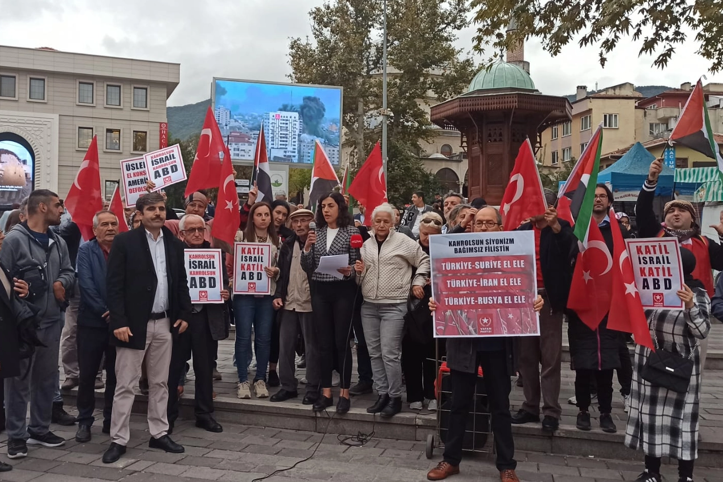Vatan Partisi Bursa İl Başkanlığı, Filistin Gazze'de sivillere yönelik yapılan saldırıyı Şehreküstü Meydanı'nda protesto etti. Vatan Partisi Bursa İl Başkanı Dilek Çınar, "Filistin direnişini destekliyorsak, Türkiye’nin güvenliğini istiyorsak, siyonizmin ve emperyalizmin yenilgisini istiyorsak, AK Parti Hükümeti dış politikasını derhal değiştirmelidir" diye konuştu.