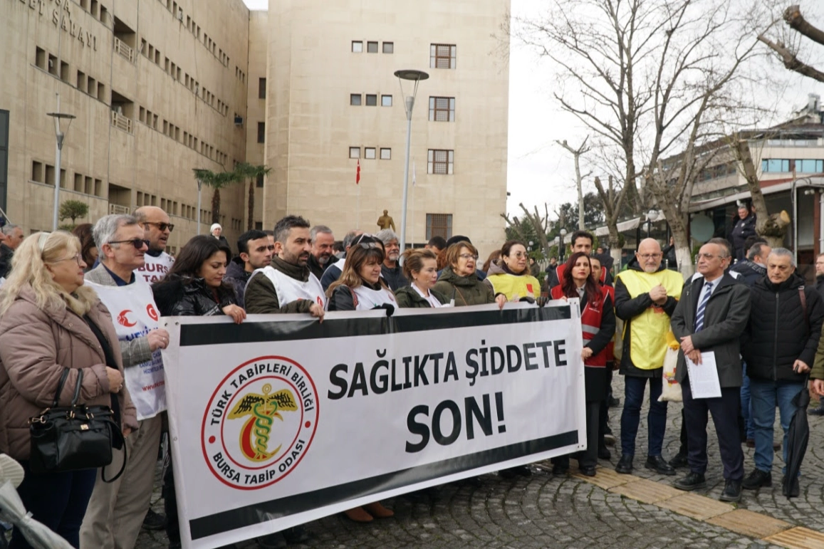 Bursa Tabip Odası (BTO) , Bursa Aile Hekimleri Derneği (Bursahed), Genel Sağlık İş Sendikası- Bursa Şubesi, Sağlık ve Sosyal Hizmetler Emekçileri Sendikası – Bursa Şubesi (SES), HEKİMSEN, Birlik ve Dayanışma Sendikası ile Sağlık Çalışanları Hak ve Mücadele Derneği’nin çağrısıyla Bursa Adliyesi önünde bir araya gelen sağlık emekçileri basın açıklaması gerçekleştirdi.