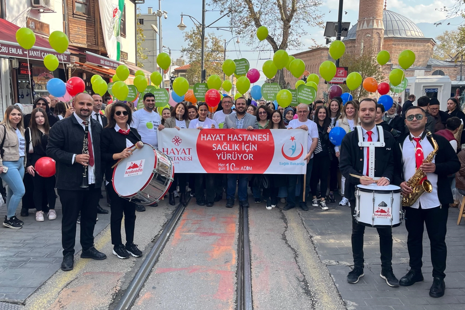 Bursa'da sağlık çalışanları, geleneksel hale getirdikleri diyabet yürüyüşüne vatandaşlar da dahil oldu. Kimi elinde telefonla o anları ölümsüzleştirirken, kimi ise alkışlarıyla sağlıkçılara destek oldu. Gerçekleştirilen yürüyüş, vatandaşların da dikkatini çekerken, Cumhuriyet Caddesi sonunda ise yeşil balonlar gökyüzüyle buluştu.