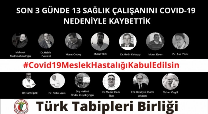 Türk Tabipleri Birliği (TTB), sosyal medya hesabından son 3 günde 13 sağlık çalışanının Covid-19 nedeniyle hayatını kaybettiğini duyurdu. Yapılan paylaşımda "Salgına karşı yeterli önlemleri almayan iktidarın politikalarından kaynaklı her gün sağlık çalışanlarını kaybediyoruz, tükeniyoruz!" ifadeleri kullanıldı.