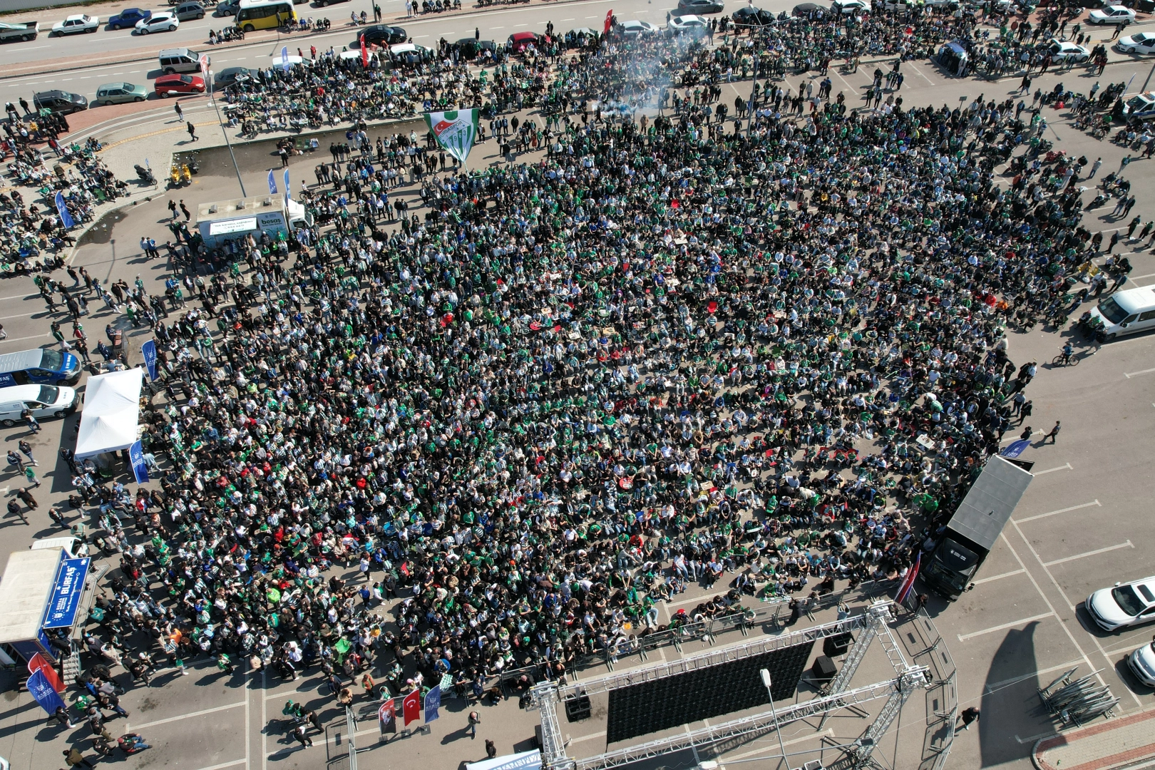 Taraftarlar için Bursa'nın çeşitli yerlerine dev ekranlar kurulurken, Acemler İstasyonu Otoparkı'na kurulan dev ekranda da Bursalılar maçı takip etti. Şampiyonluk coşkusu ile ellerinde atkıyla alana gelenler maçın ikinci yarısını heyecanla bekliyor. Yüzlerce taraftarın oluşturduğu kalabalık dron ile havadan görüntülendi.