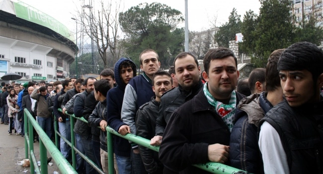 Bursasporlu taraftarlar, Biletix'in Bursa Atatürk Stadı önündeki bilet satış gişesine akın etti. Yağmura rağmen taraftarlar gişe önünde uzun kuyruk oluşturdu.