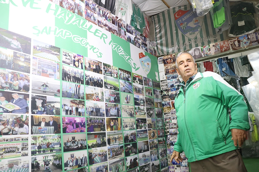 Yalova'da yaşayan 70 yaşındaki Şahap Gümüş, taraftarı olduğu Bursaspor'un adını taşıyan sokakta kurduğu müzede Türkiye'nin ve dünyanın farklı noktalarından gelen formaları, takım kaşkollarını, kulüp armalı porselenleri, fotoğrafları ve birçok eşyayı sergiliyor.