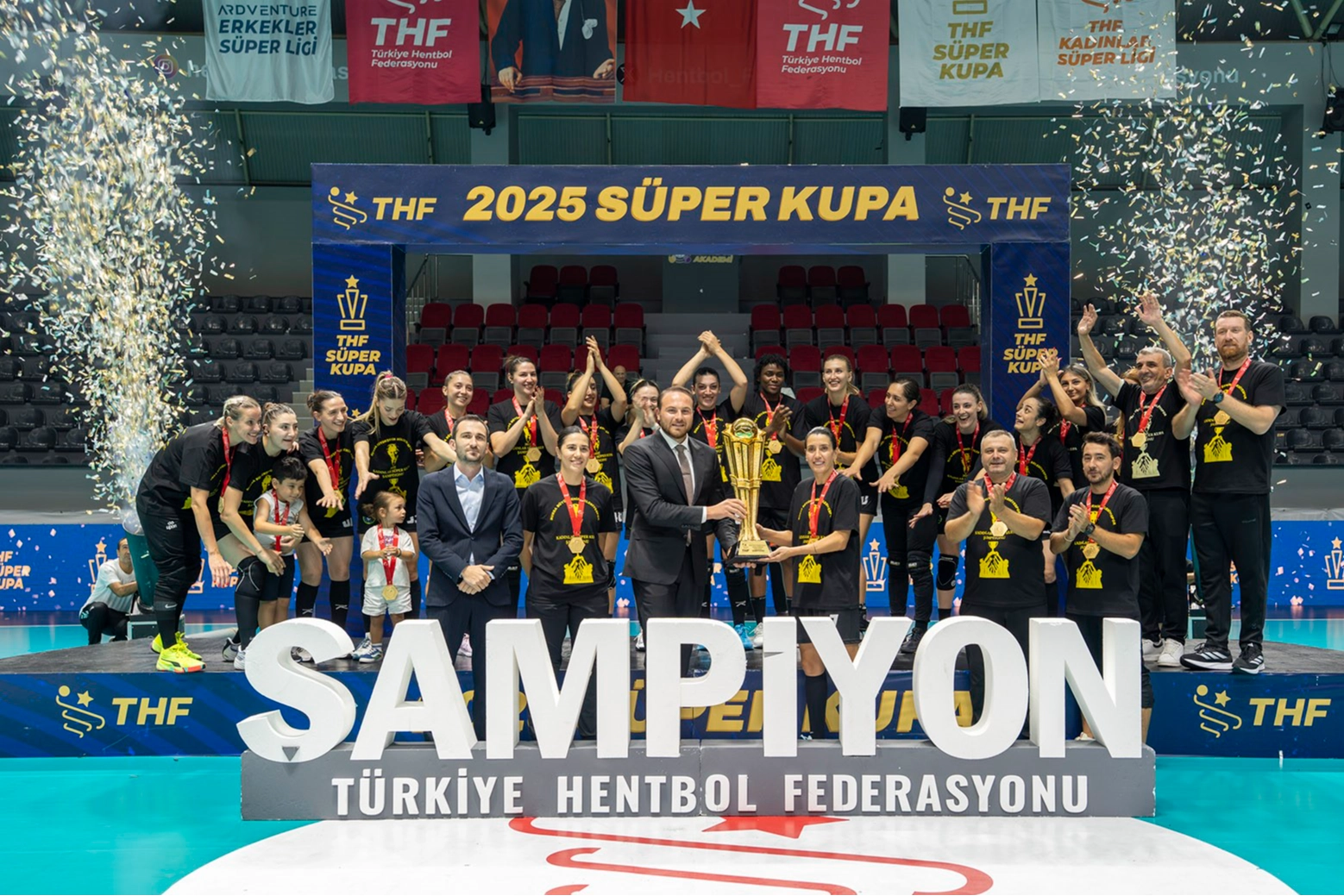 Hentbol Kadınlar Süper Kupa 2025’in şampiyonu Bursa Büyükşehir Belediyesi Spor Kulübü, maçın ardından düzenlenen törende kupa ve madalyalarını aldı. Türkiye Hentbol Federasyonu Başkanı Mesut Çebi ve Yönetim Kurulu Üyesi Sinan Başer, şampiyon Bursa Büyükşehir Belediyesi Spor Kulübü’ne kupa ve madalyalarını takdim etti.