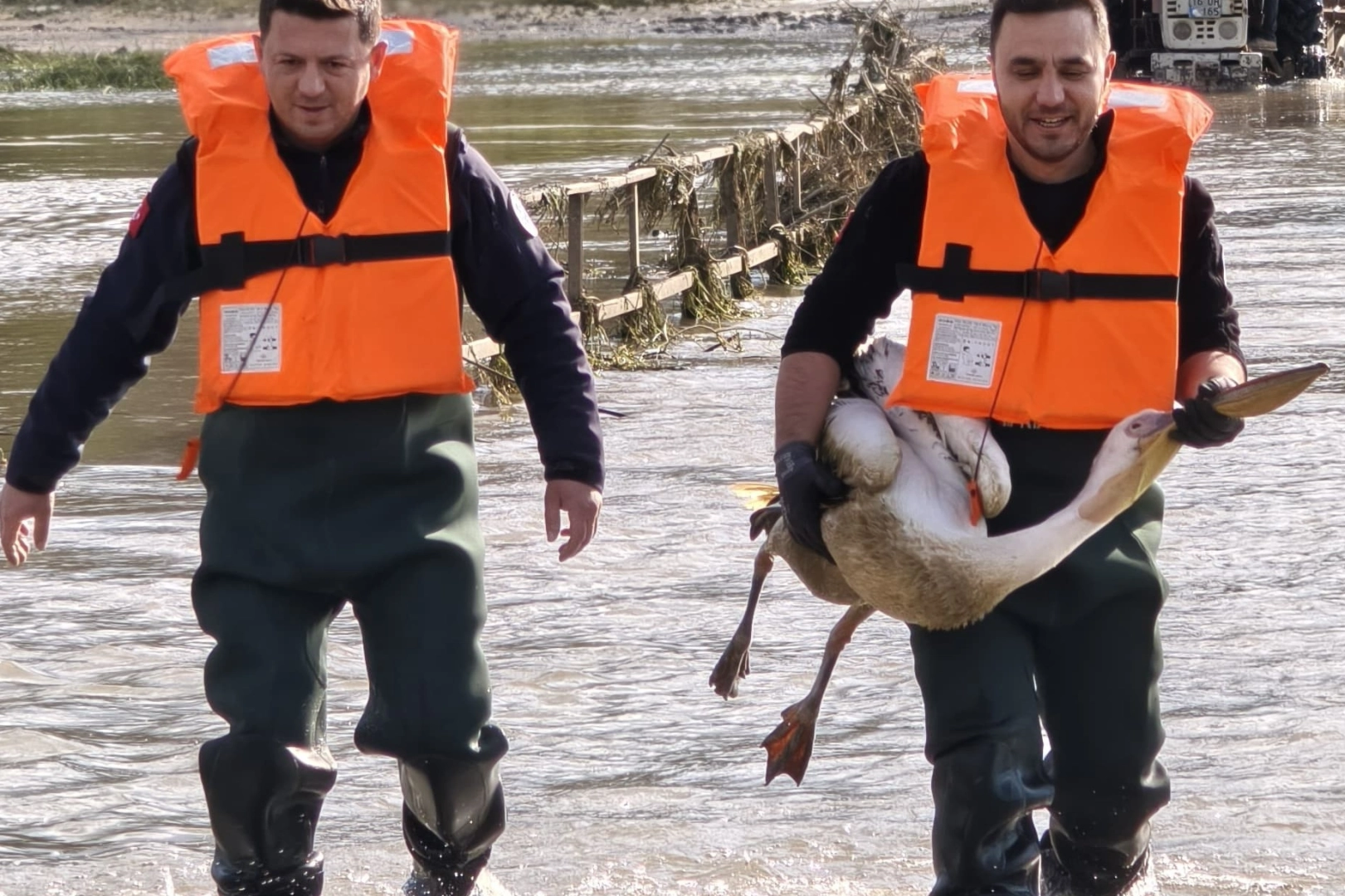Zorlu şartlarda gerçekleştirilen çalışmada, çalılıklar arasında sıkıştığı belirlenen yaralı pelikan bulunduğu yerden dikkatli bir şekilde çıkarıldı.