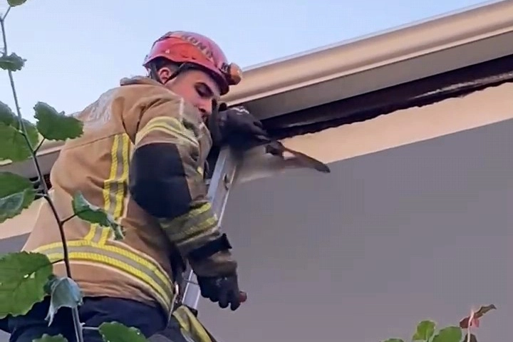 Kısa sürede olay yerine gelen itfaiye ekipleri, çatıya çıkarak yağmur suyu tahliye kanalını kontrol etti. Yapılan çalışmada ebabil kuşunun saçağa sıkıştığı tespit edildi. Titiz bir çalışmayla sıkıştığı yerden çıkarılan kuş, zarar görmeden kurtarıldı.