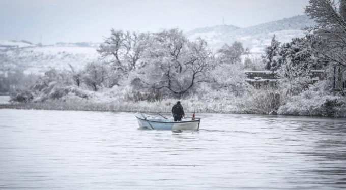 Yoğun kar yağışının ardından, tamamen beyaz örtüyle kaplanan Gölyazı'ya gelen ziyaretçiler, talebe göre gölde balıkçı ve saltanat kayıklarıyla gezinti yapabiliyor.