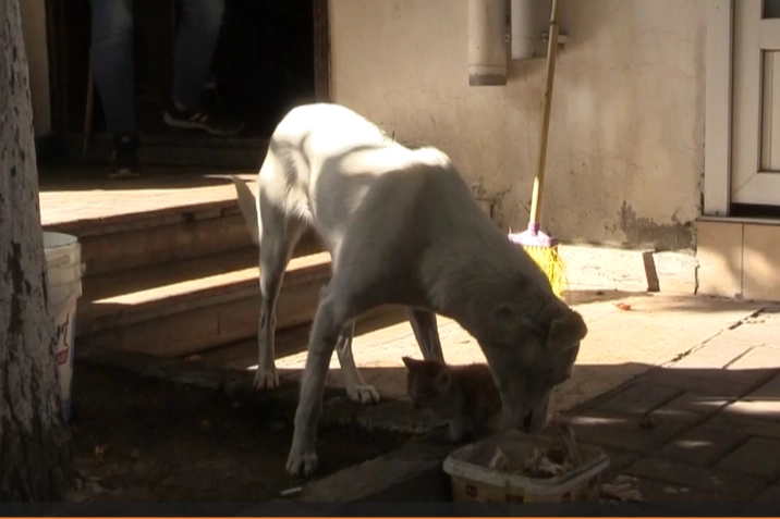 "Bir gün burada 2-3 tane yavru kedi gördük bir akşamüstü sanki birisi bırakmıştı, anneleri de yoktu, daha sonra diğer ikisi kayboldu. Bu kalan sarı, ufak kedi ölmek üzereydi, biz bakmaya başladık. Ondan sonra bir baktık ki ertesi gün bu beyaz köpek yavruyu ağzına alıp, koynuna götürdü ve akşama kadar sanki kendi yavrusuymuş gibi resmen bakıyordu, yalıyordu. Bir annelik içgüdüsüydü, yani öyle bir olaydı ki biz çok etkilendik. Fakat çok özel bir olay, bilmiyorum ben çok etkilendim. Bir haftadır bu hayvana sahip çıkıyor. Götürüyor, getiriyor, taşıyor. Neresi sıcaksa sıcak yerleri seçiyor. Bu köpek resmen bu yavruya annelik yapıyor."
