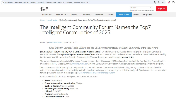 Dünya genelindeki kentlerin akıllı şehircilik, dijital dönüşüm ve sürdürülebilir kalkınma alanlarındaki performanslarını değerlendiren ICF (Akıllı Topluluk Forumu), Bursa Büyükşehir Belediyesi’nin dijital şehircilik uygulamaları sonucunda daha önceden ‘Smart21 Communities of 2025’ listesine seçtiği Bursa’yı bu kez ‘Top7 Intelligent Communities’ listesine seçerek dünyanın en akıllı 7 kentinden biri olarak gösterdi.
