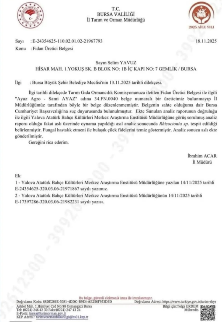 Konuya ilişkin iddiaları gündeme getiren Belediye Meclisi'nin AK Partili Üyesi Selahattin Külcü, alım işini yapacak firmanın gerçekte tarım ve fidan işi yapmadığını, İl Tarım ve Orman Müdürlüğü'nün sahte evrak düzenlenmesi konusunda Bursa Cumhuriyet Başsavcılığı'na suç duyurusunda bulunduğunu açıkladı.